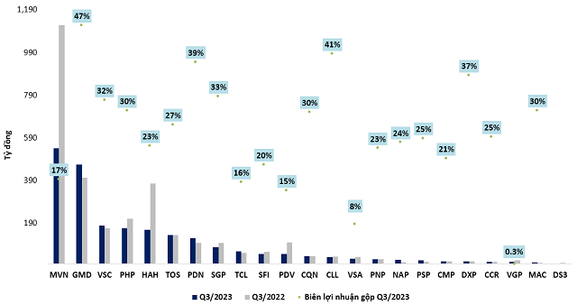 The third quarter of 2023 proved to be a challenging period for logistics companies, with the total gross revenue of the reporting companies exceeding 11.6 trillion VND, a 10% decrease compared to the same period last year. Many companies in the industry experienced negative growth, such as MVN (Vinalines), HAH (Hai An Transport and Stevedoring Joint Stock Company), and notably VSA (Vietnam Maritime Agent Joint Stock Company), which saw a significant 38% drop in gross revenue.