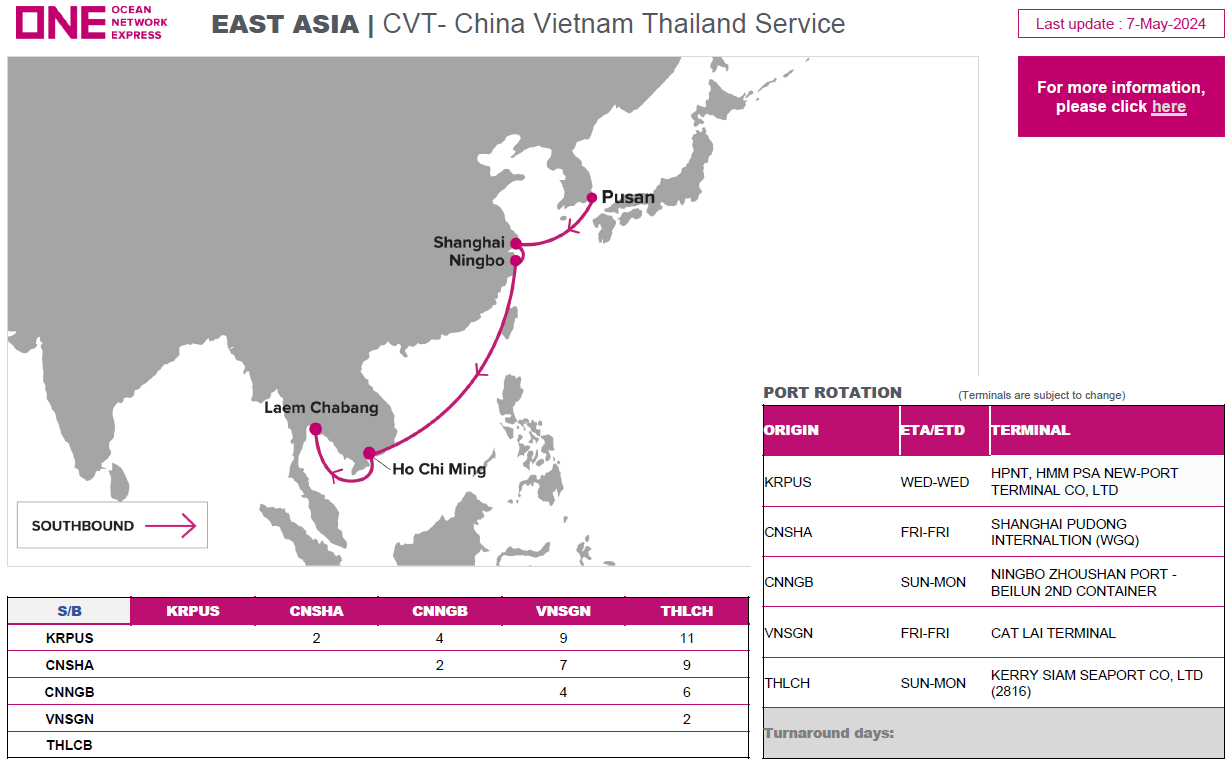 “Với việc ra mắt dịch vụ CVT,” ONE nhấn mạnh, “chúng tôi đã cải thiện đáng kể phạm vi hoạt động của mình từ Busan, Hàn Quốc đến Việt Nam và Thái Lan.” Tuyến đường mới này mang lại cho các doanh nghiệp sự linh hoạt và hiệu quả hơn trong việc vận chuyển hàng hóa giữa các điểm đến này.