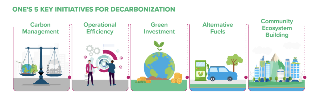 Chiến lược Xanh của ONE đặt ra mục tiêu tham vọng Không phát thải ròng khí nhà kính (GHG) vào năm 2050. Một phần cốt lõi của chiến lược này là quá trình chuyển đổi từ nhiên liệu thông thường sang nhiên liệu thay thế. Trên hành trình theo đuổi mục tiêu này, ONE sẽ tiếp tục nghiên cứu và khảo sát các loại nhiên liệu thay thế.